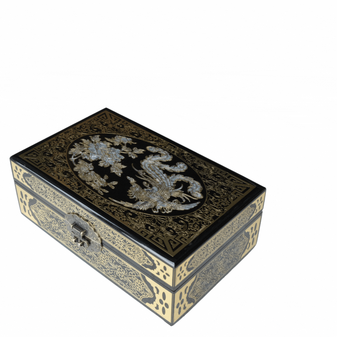 The centrepiece of this design is a mesmerizing phoenix rising amidst blooming flowers β a powerful symbol of renewal, grace, and inner fire. Carefully inlaid with genuine mother of pearl, the motif shimmers with ethereal colour and texture, capturing light and attention from every angle. The elegant lines of the composition flow harmoniously with the sleek lacquer surface, creating a feeling of movement, life, and quiet power.