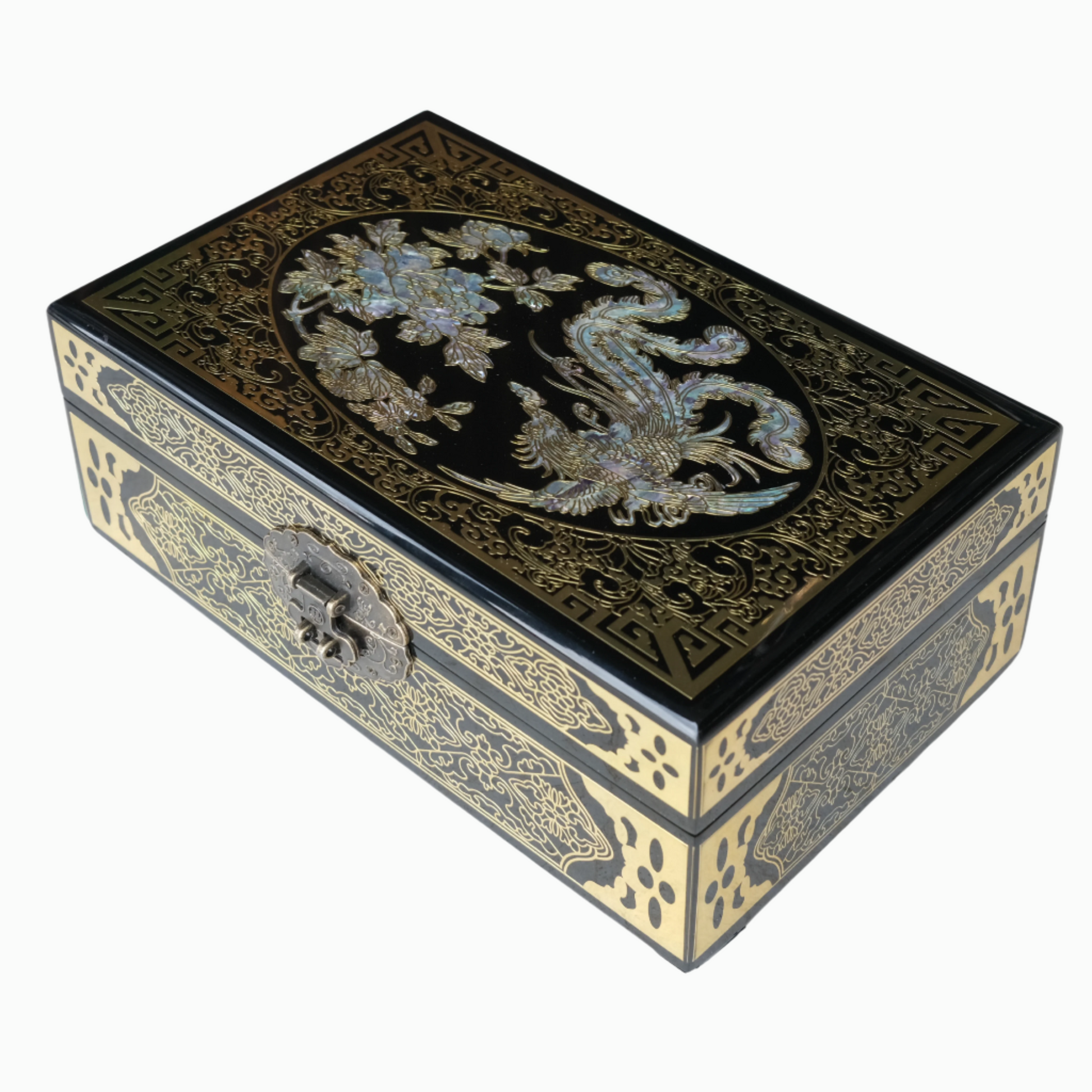 - Elegant phoenix and floral motif inlaid with authentic mother of pearl