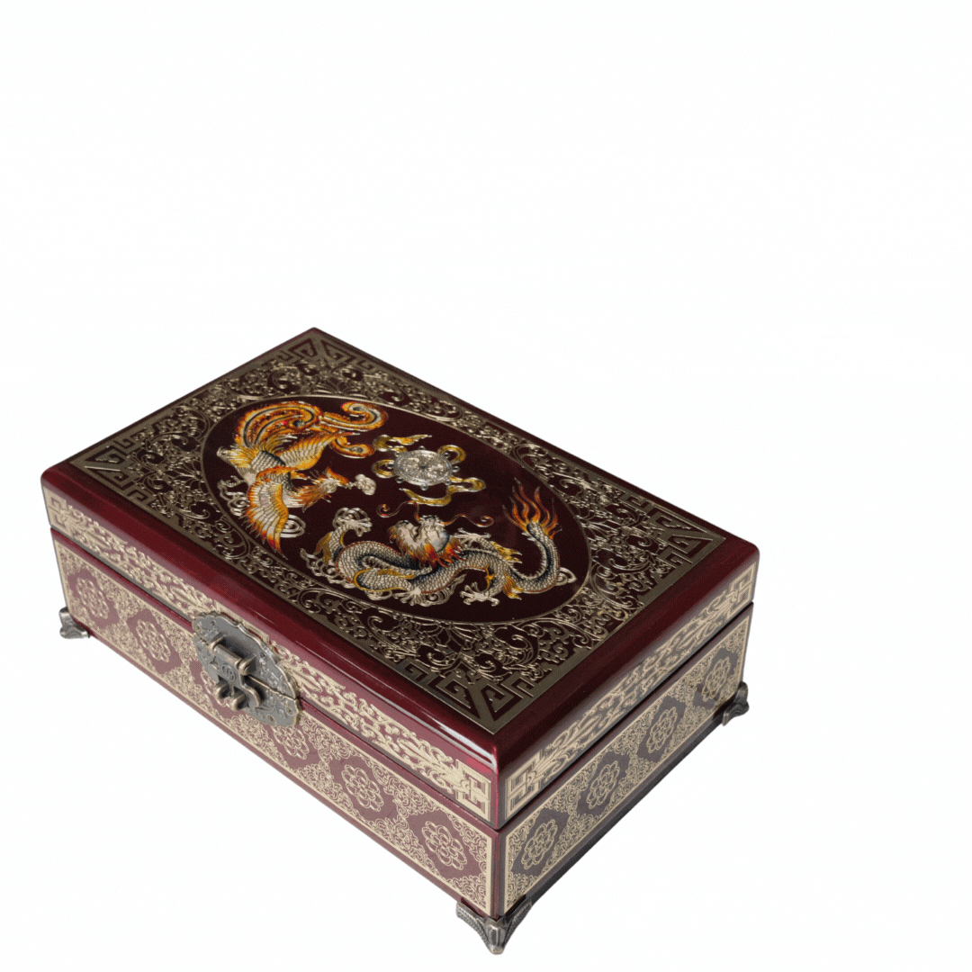 At its heart lies an extraordinary dragon and phoenix motif, two legendary creatures that together represent harmony, balance, and auspicious union in many Eastern traditions. This striking design is rendered in genuine mother of pearl inlay, catching the light with a mesmerizing iridescence that shifts and dances with every glance. The fluid, dynamic lines of the motif pair perfectly with the glass-like lacquer finish, resulting in a visual masterpiece that’s both powerful and serene.