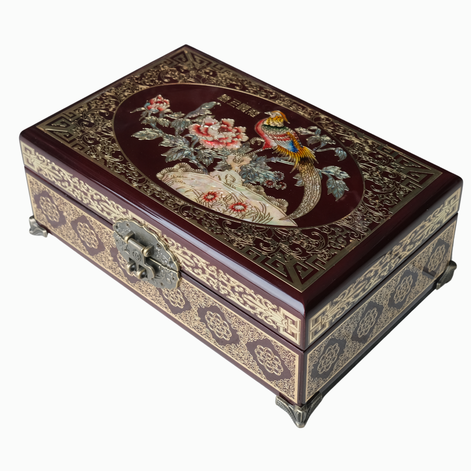 At the centre of its design is a striking pheasant motif — a bird revered in many cultures as a symbol of prosperity, beauty, and good fortune. This majestic creature is brought to life through the intricate use of mother of pearl inlay, lending a shimmering iridescence that shifts gracefully with the light. The radiant accents, paired with the lacquer's glass-like finish, create a visual harmony that is both opulent and serene.