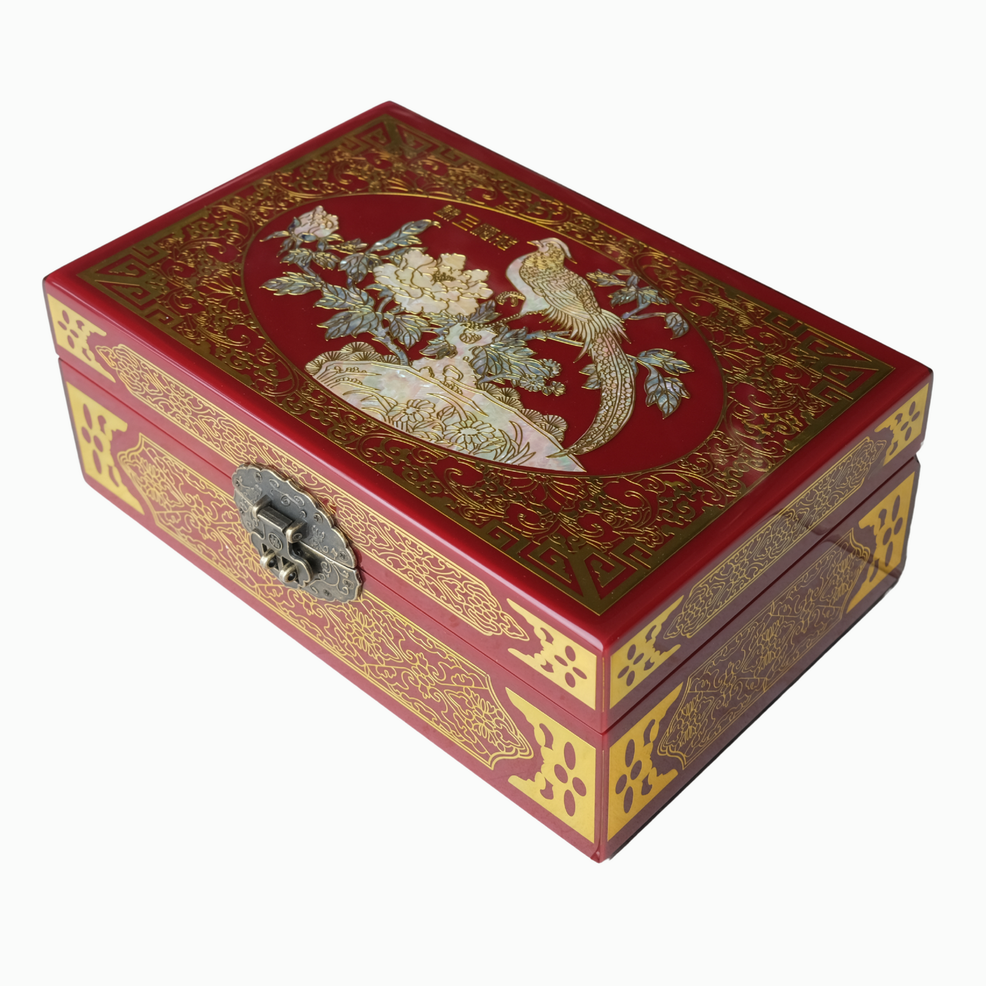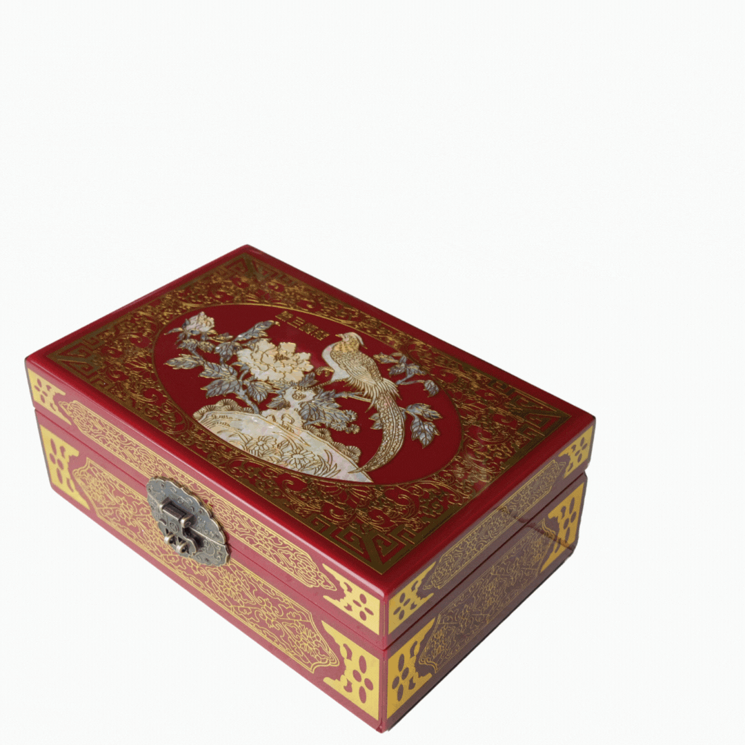 At the centre of its design is a striking pheasant motif — a bird revered in many cultures as a symbol of prosperity, beauty, and good fortune. This majestic creature is brought to life through the intricate use of mother of pearl inlay, lending a shimmering iridescence that shifts gracefully with the light. The radiant accents, paired with the lacquer's glass-like finish, create a visual harmony that is both opulent and serene.